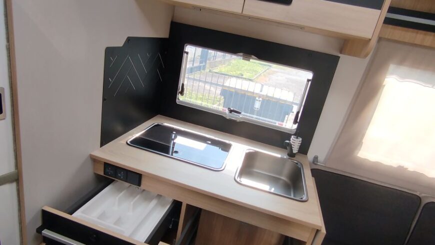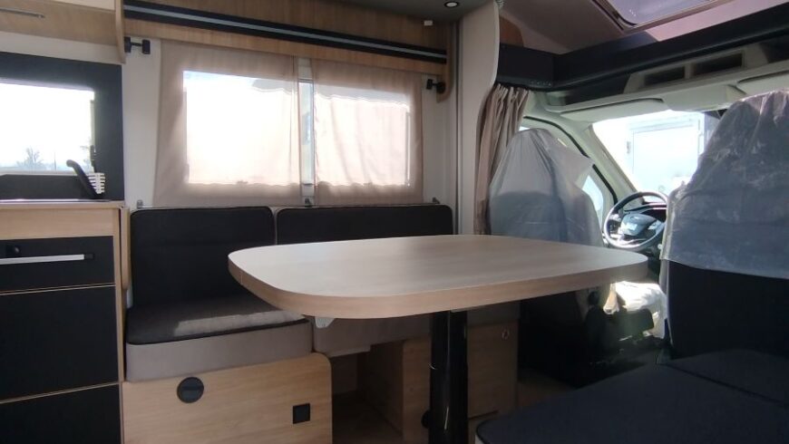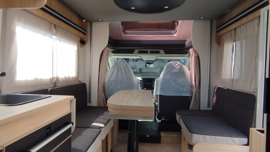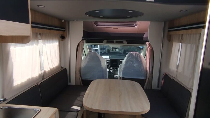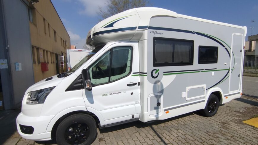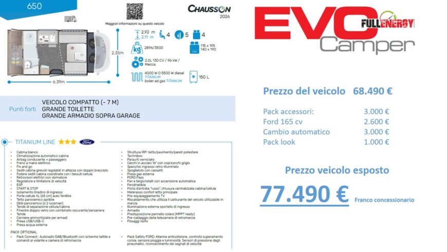 Chausson 650 Titanium è un camper semi integrale dalle dimensioni compatte e spazioso, solo 6.39 m. di lunghezza, con letto basculante, su motorizzazione Ford 165 cv con cambio automatico. Veicolo omologato 4 posti viaggio 4 posti letto, ideale per la coppia, con ampia dinette face to face, ampio bagno con doccia separata ed un capiente armadio. E’ presente anche un ampio gavone nella parte posteriore per le biciclette. Nell’ampia smart lounge c’è un letto basculante matrimoniale elettrico, l’altro letto, sempre per due persone, lo si può ricavare dalla trasformazione della dinette. Riscaldamento a gasolio Webasto e boiler a gas, frigorifero a compressore grande da 150 litri.