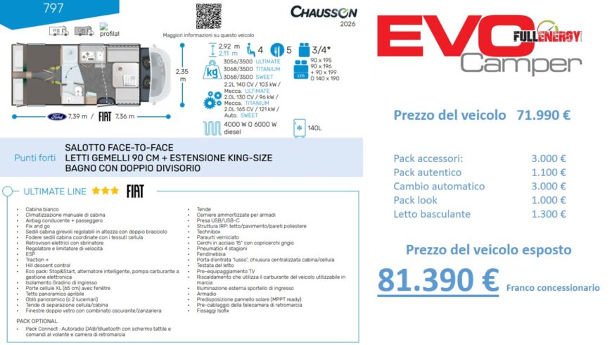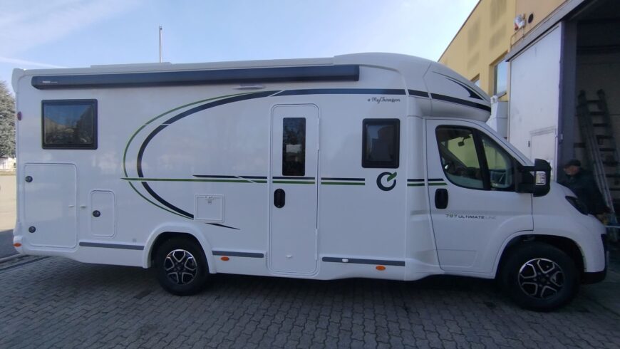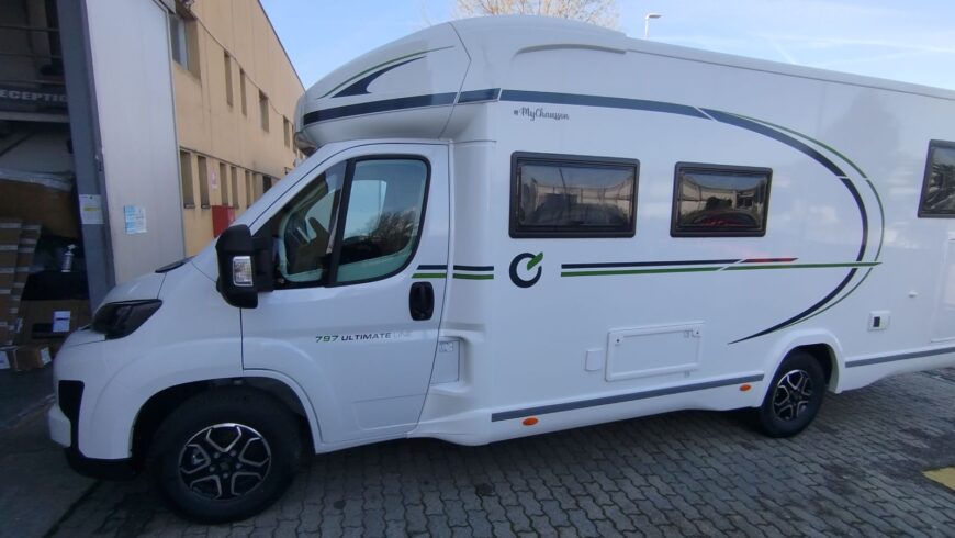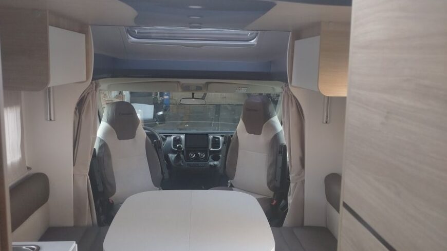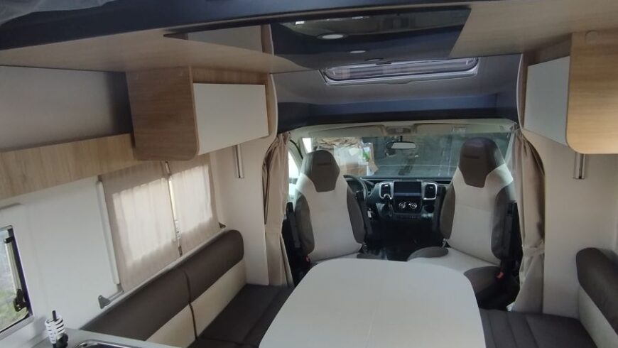 CHAUSSON 797 Ultimate Line, semi integrale full optional con letto basculante e lettini gemelli in coda, ottimo sia per la coppia che la famiglia, omologato 4 posti viaggio/letto. Motorizzazione Fiat Ducato 2.200 cc cv 140 con cambio automatico a 8 rapporti, dinette face to face, sedili guida e passeggero girevoli con ampia dinette che ospita comodamente 5 posti. Servizi bagno doccia separati, riscaldamento Truma a gasolio.