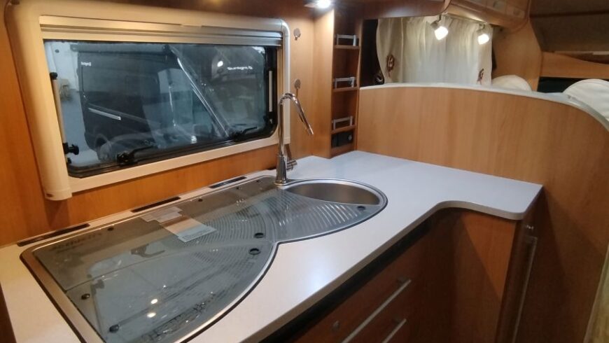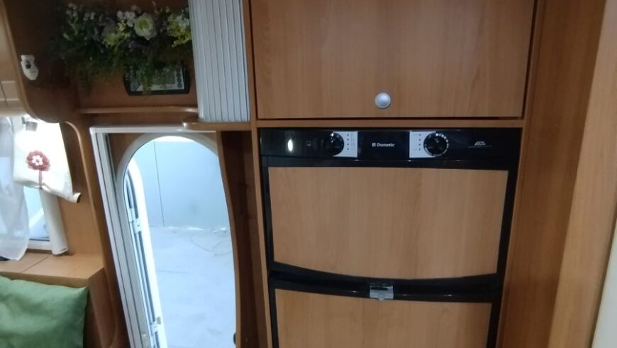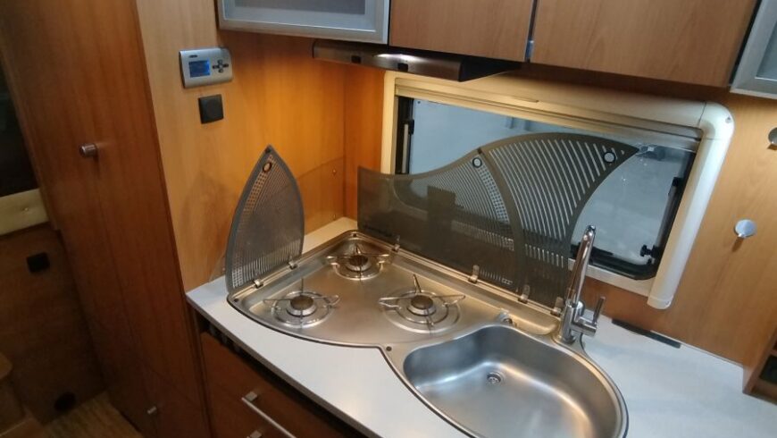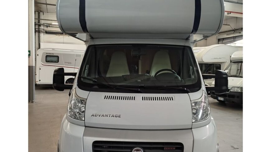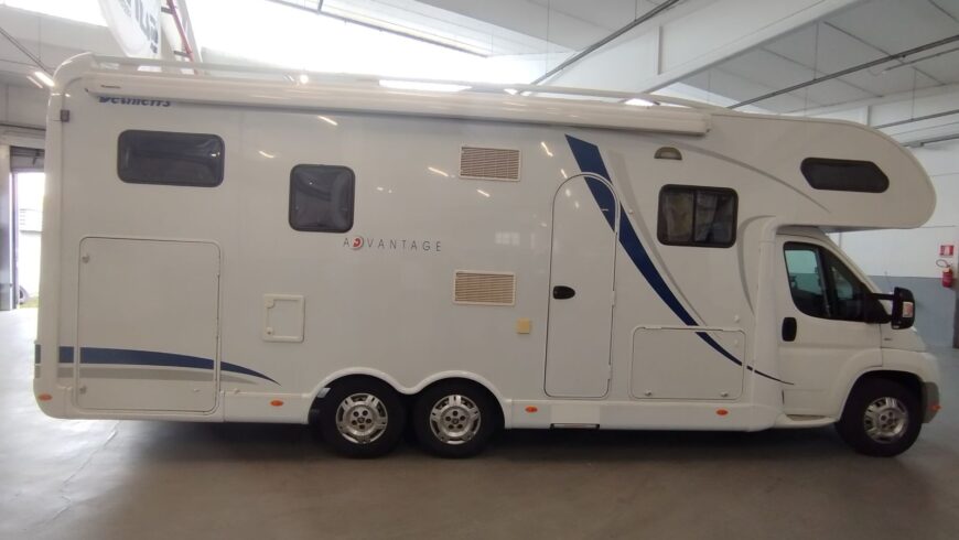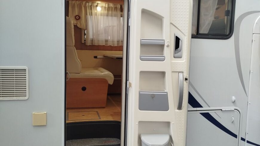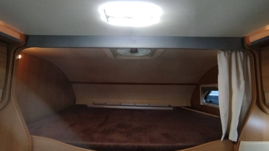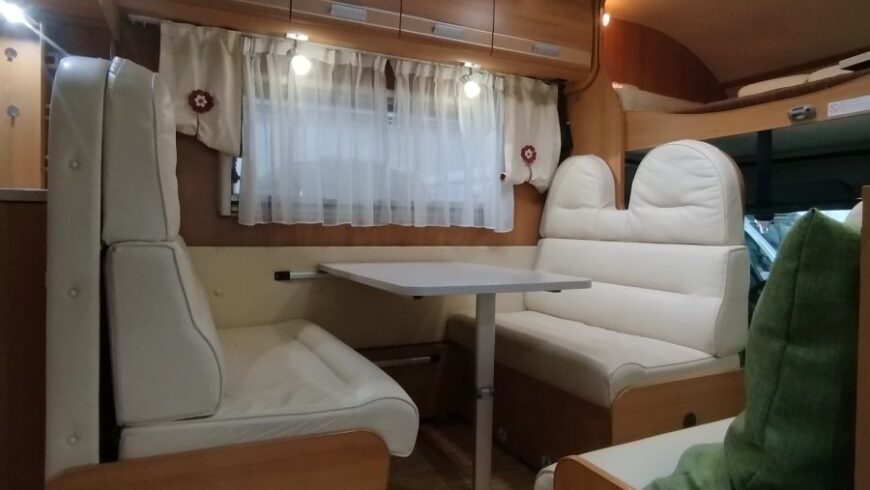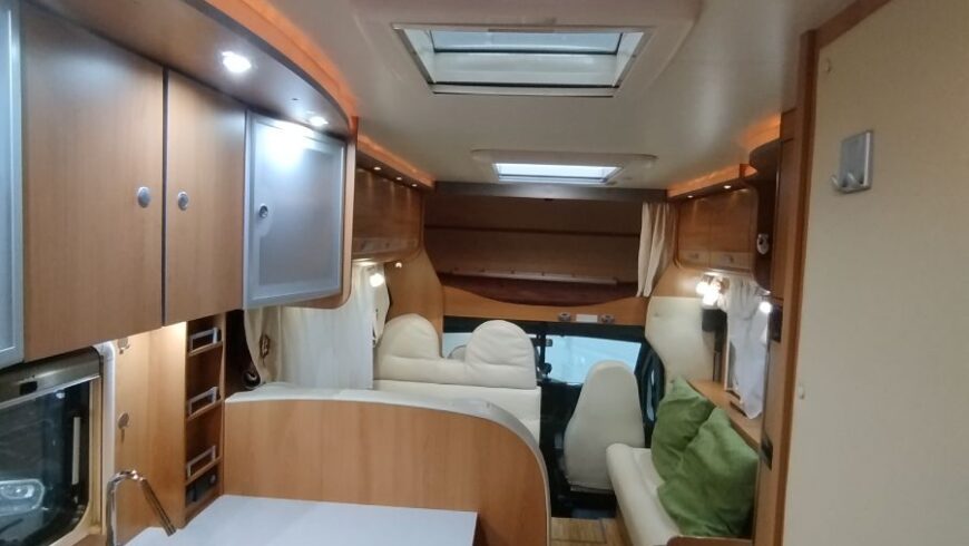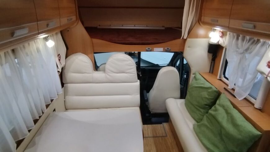 Veicolo dalle grandi dimensioni di alta qualità, con doppio pavimento, ideale per la famiglia o gruppi numerosi, ampia dinette a 4 posti con divanetto laterale trasformabile in letto matrimoniale, gran letto matrimoniale in mansarda e letto matrimoniale trasversale su ampio garage. Ampio armadio, blocco cucina a tre fuochi, frigo grande da 140 l. con cella freezer separata, bagno con box doccia separato e calorifero, riscaldamento ALDE ed impianto luci full led.